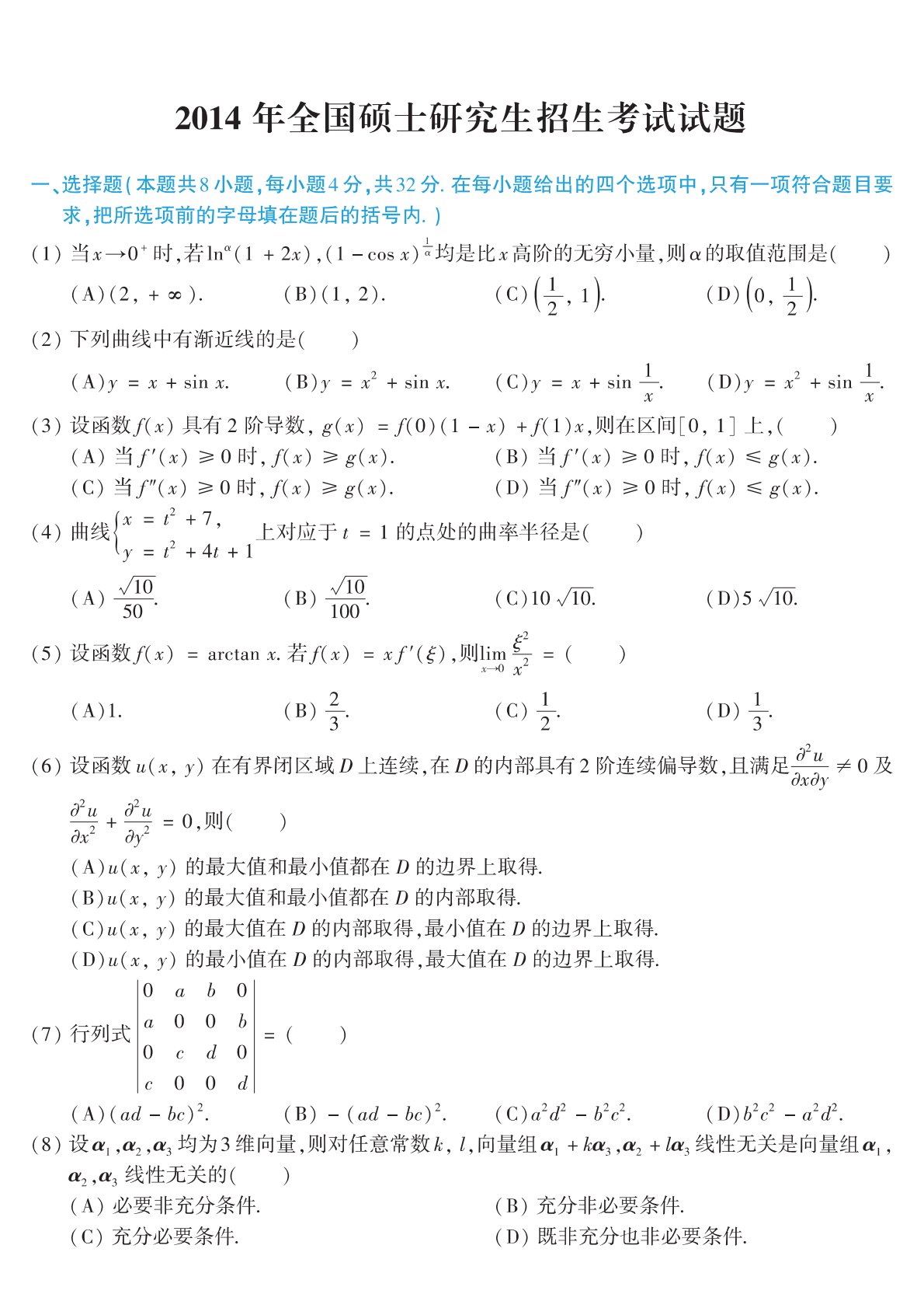 302数学二2014年考研初试真题