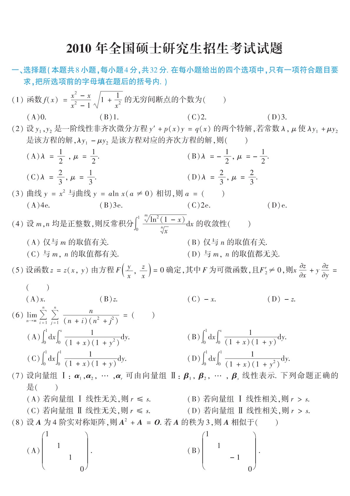 302数学二2010年考研初试真题