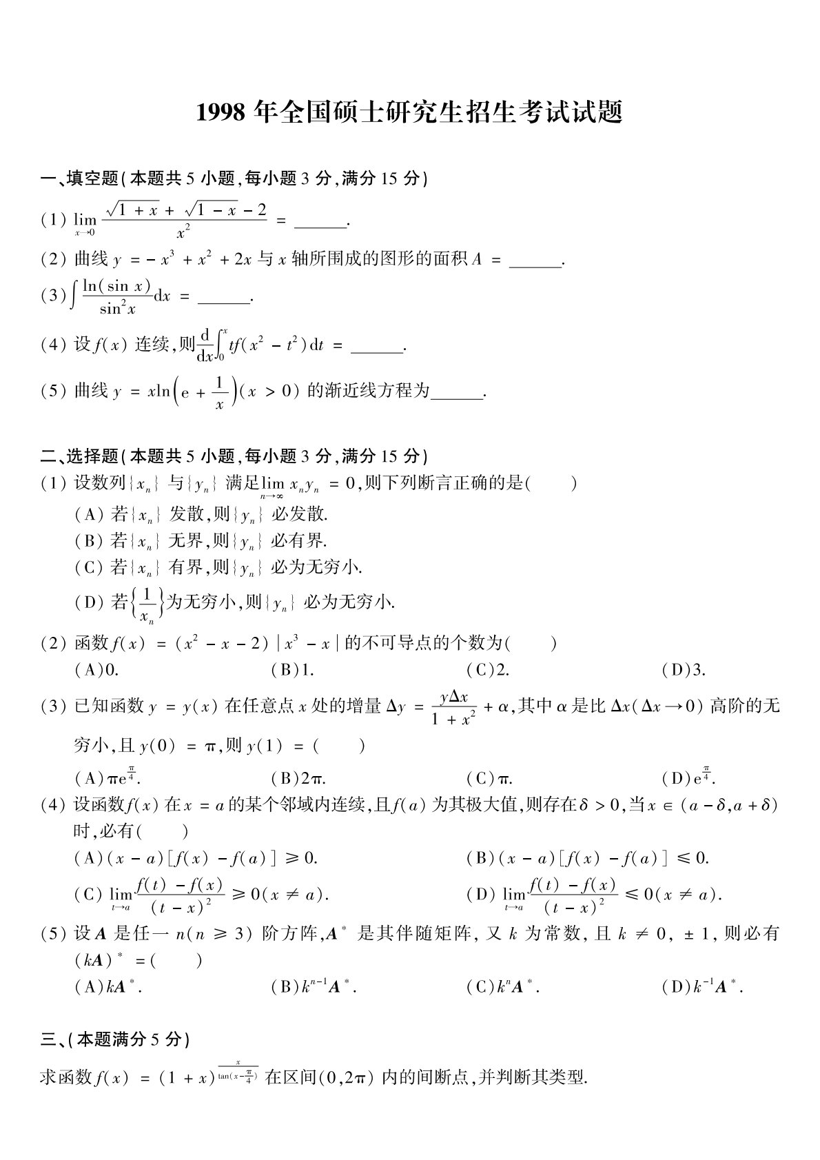 302数学二1998年考研初试真题