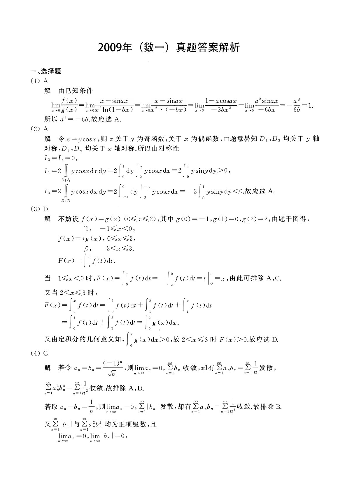 301数学一2009年考研初试真题参考答案