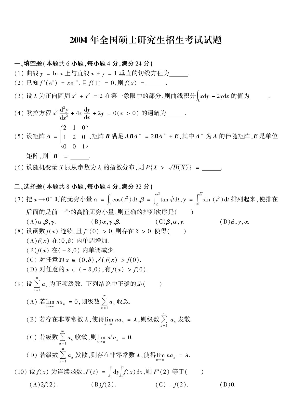 301数学一2004年考研初试真题