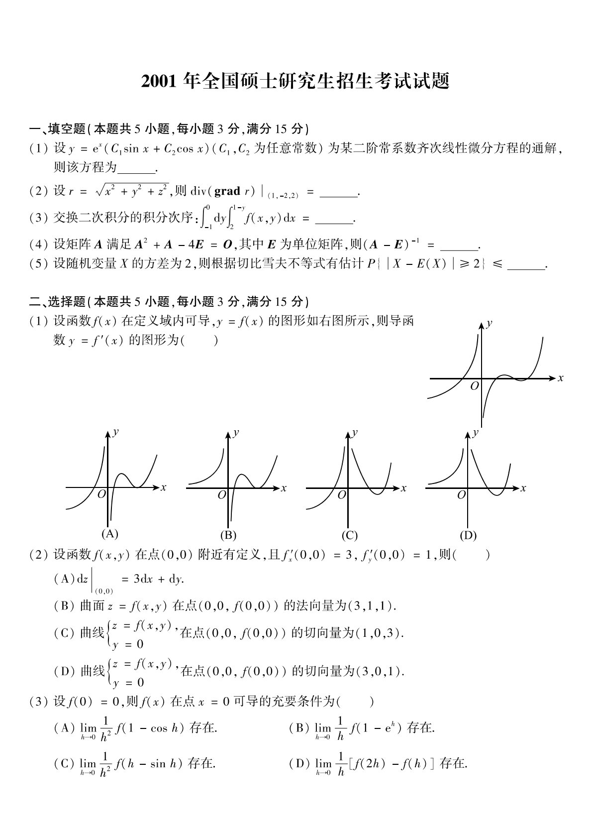 301数学一2001年考研初试真题