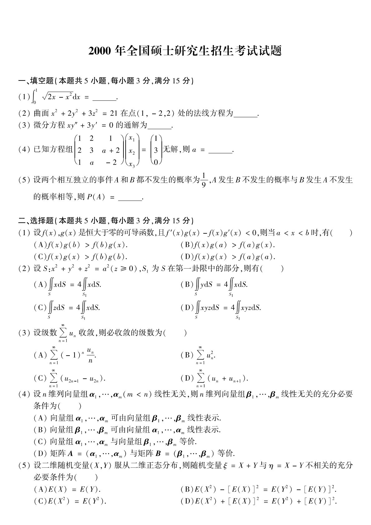 301数学一2000年考研初试真题