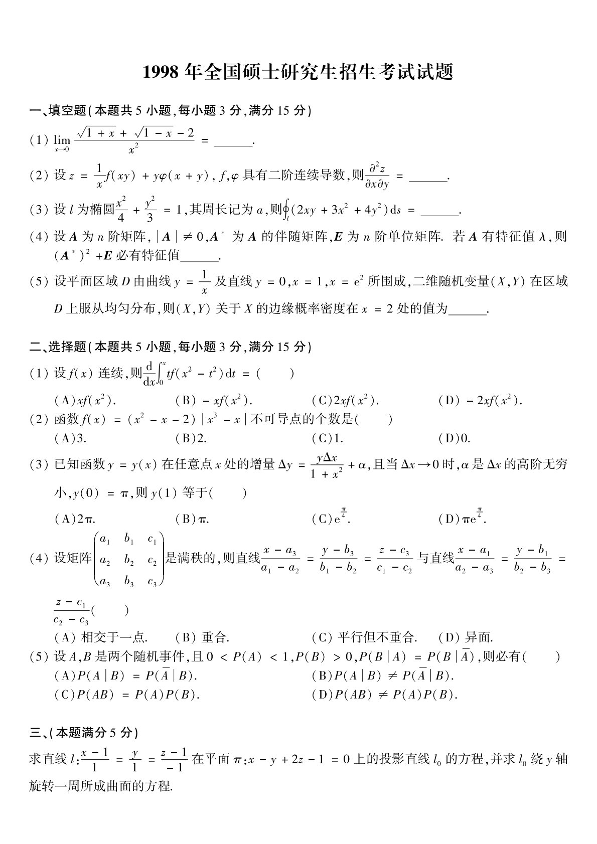 301数学一1998年考研初试真题