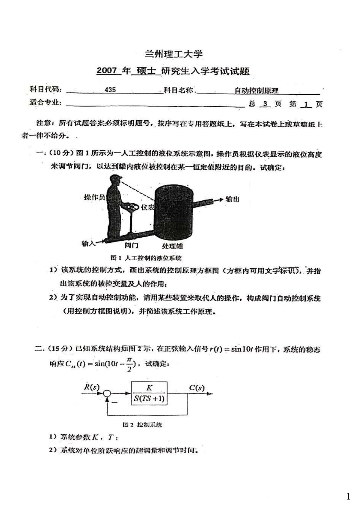 兰州理工大学835自动控制原理2007年真题