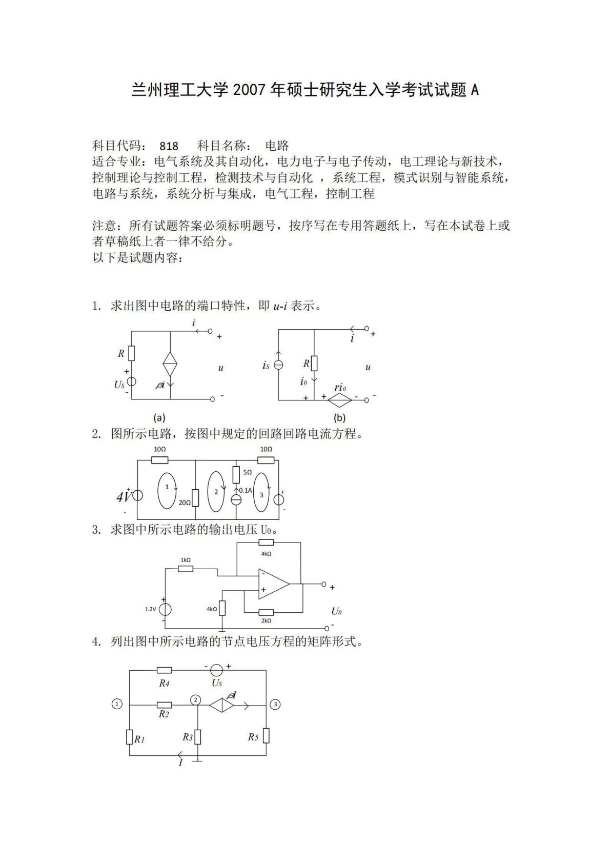 兰州理工大学818电路2007年真题
