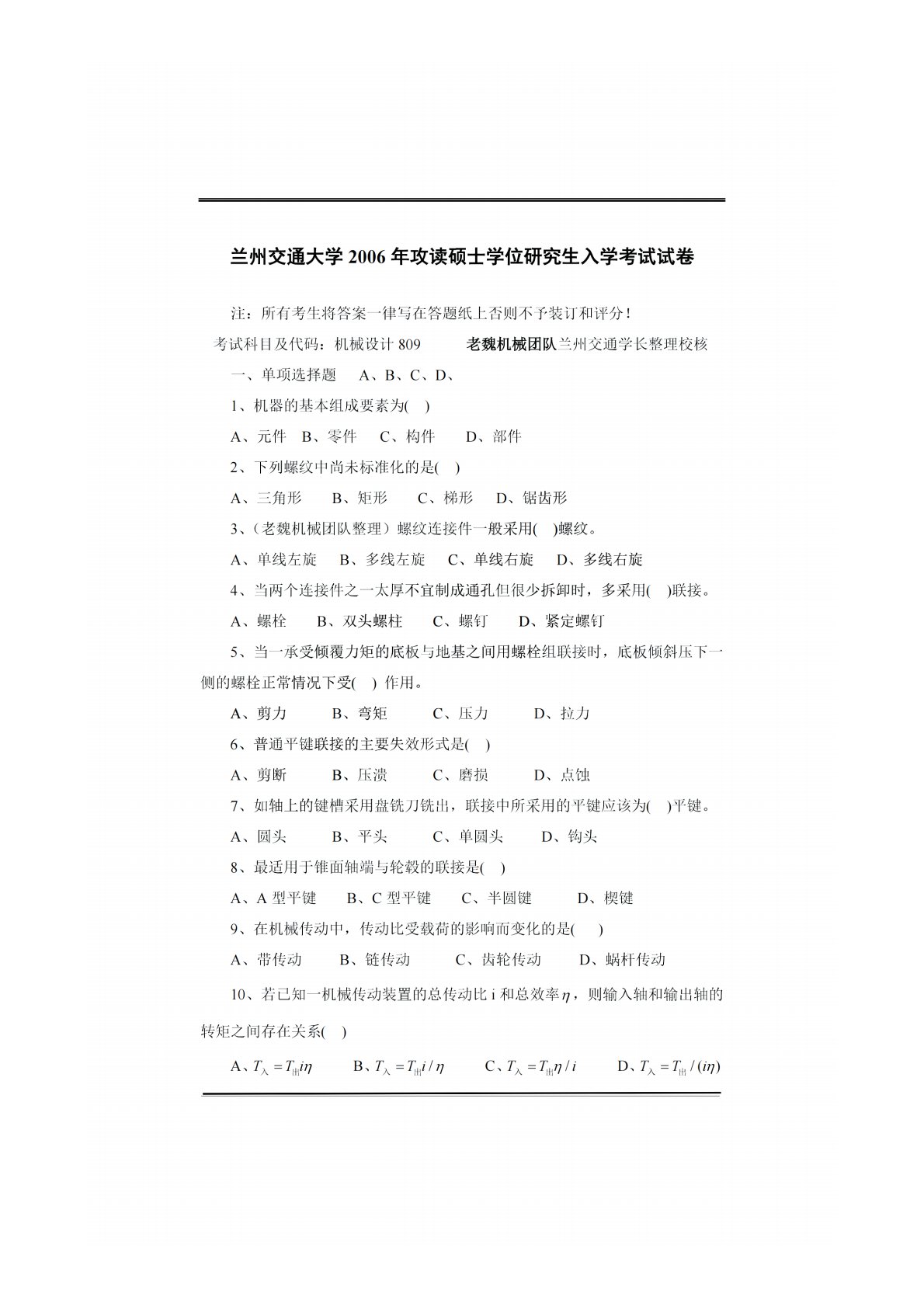 兰州交通大学809机械设计2006年真题