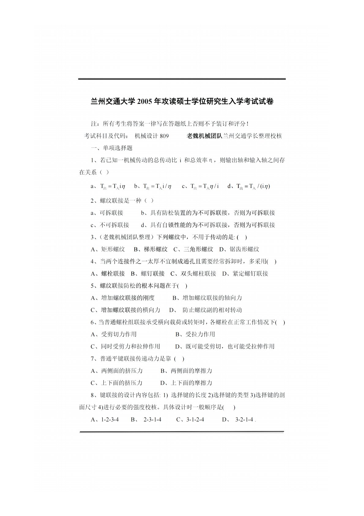 兰州交通大学809机械设计2005年真题