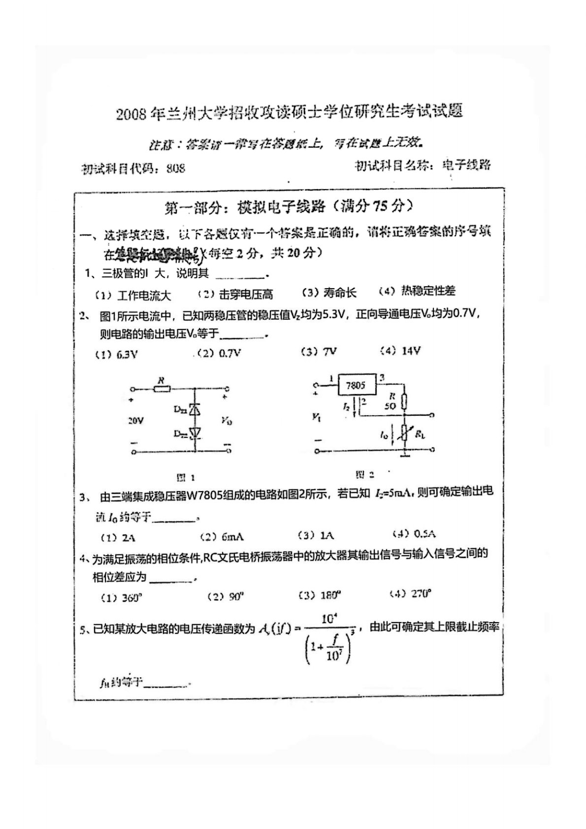 兰州大学805电子线路基础(模拟电路、数字电路)2008年真题