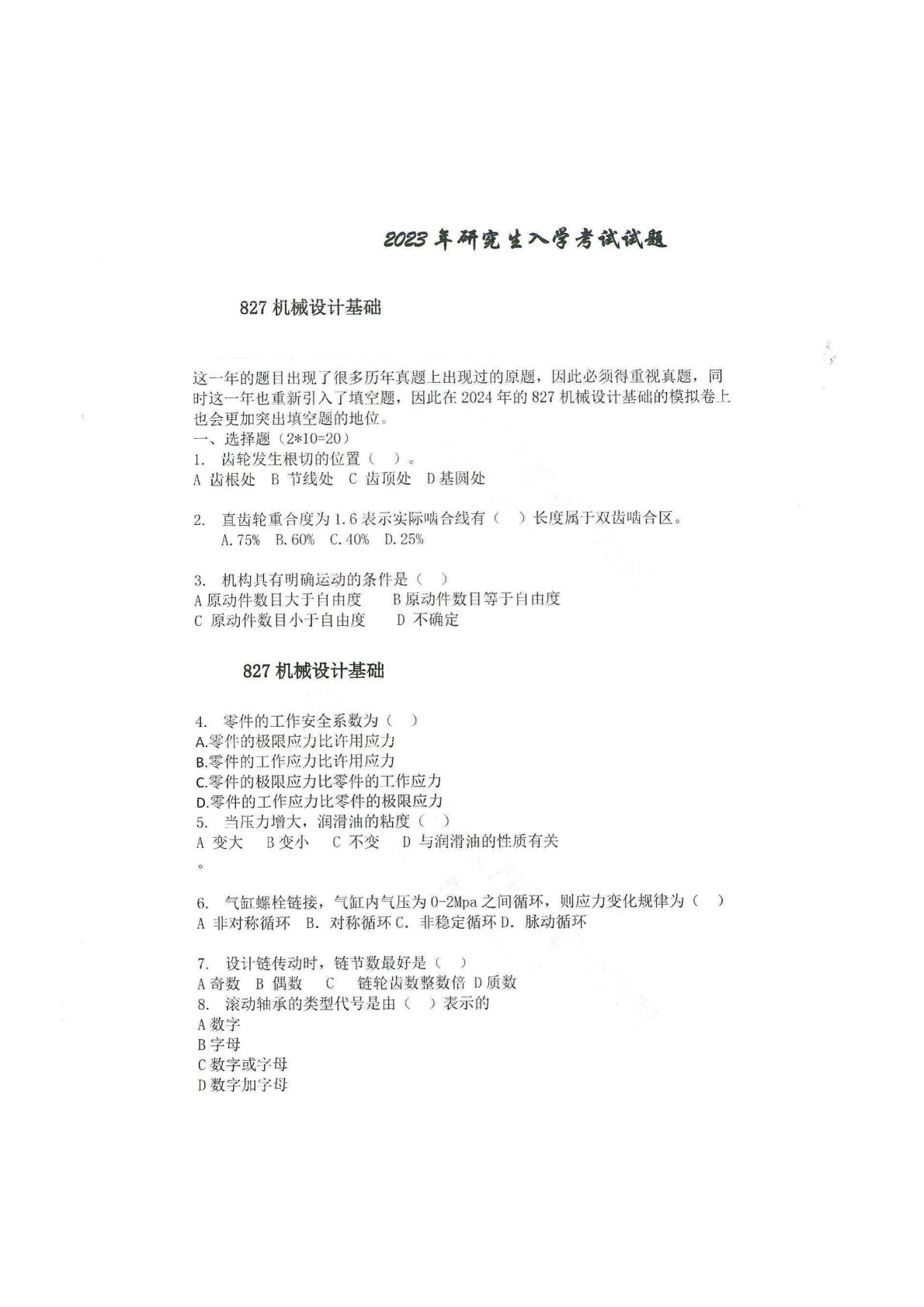 南昌大学827机械设计基础2023年真题
