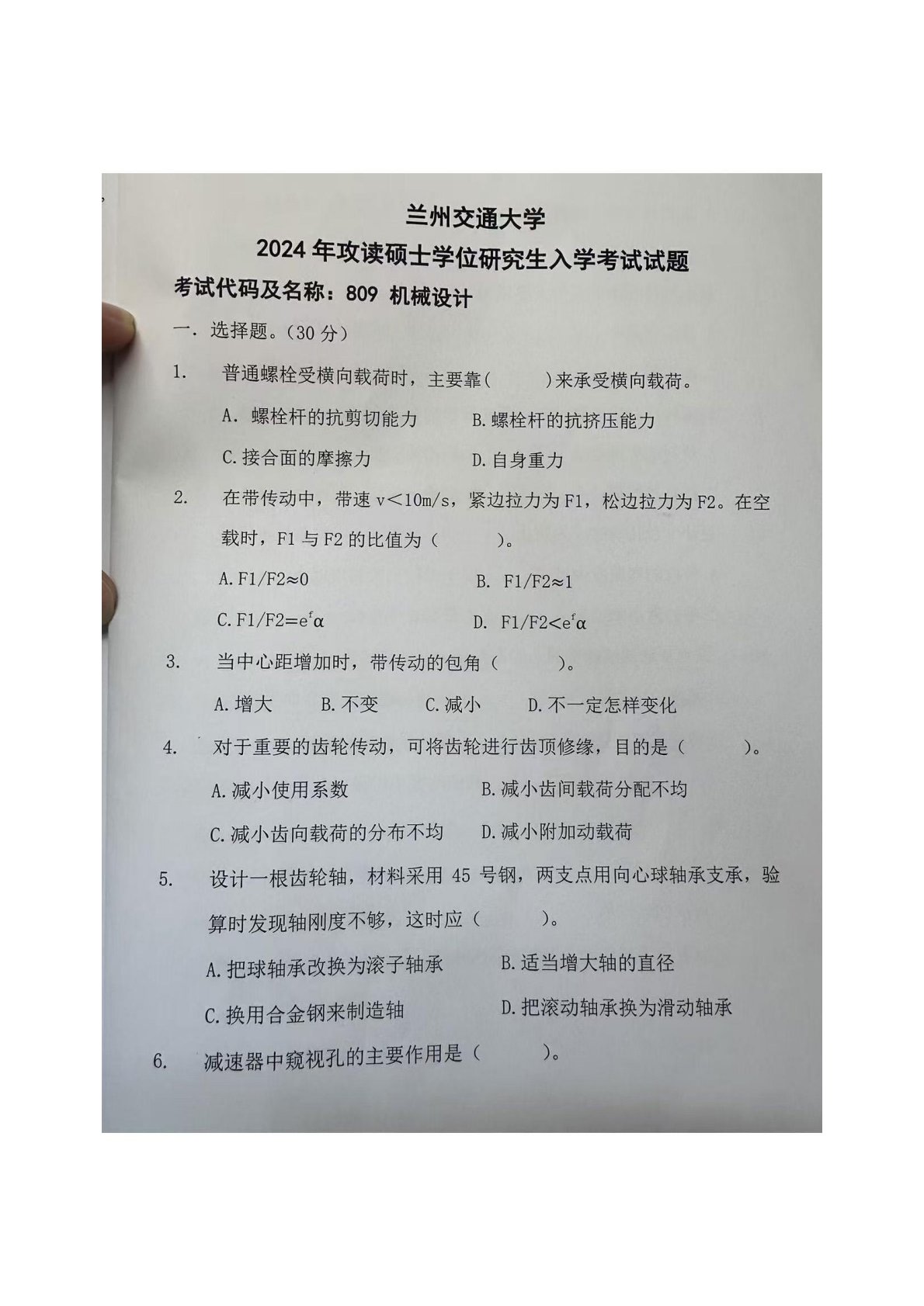 兰州交通大学809机械设计2024年真题