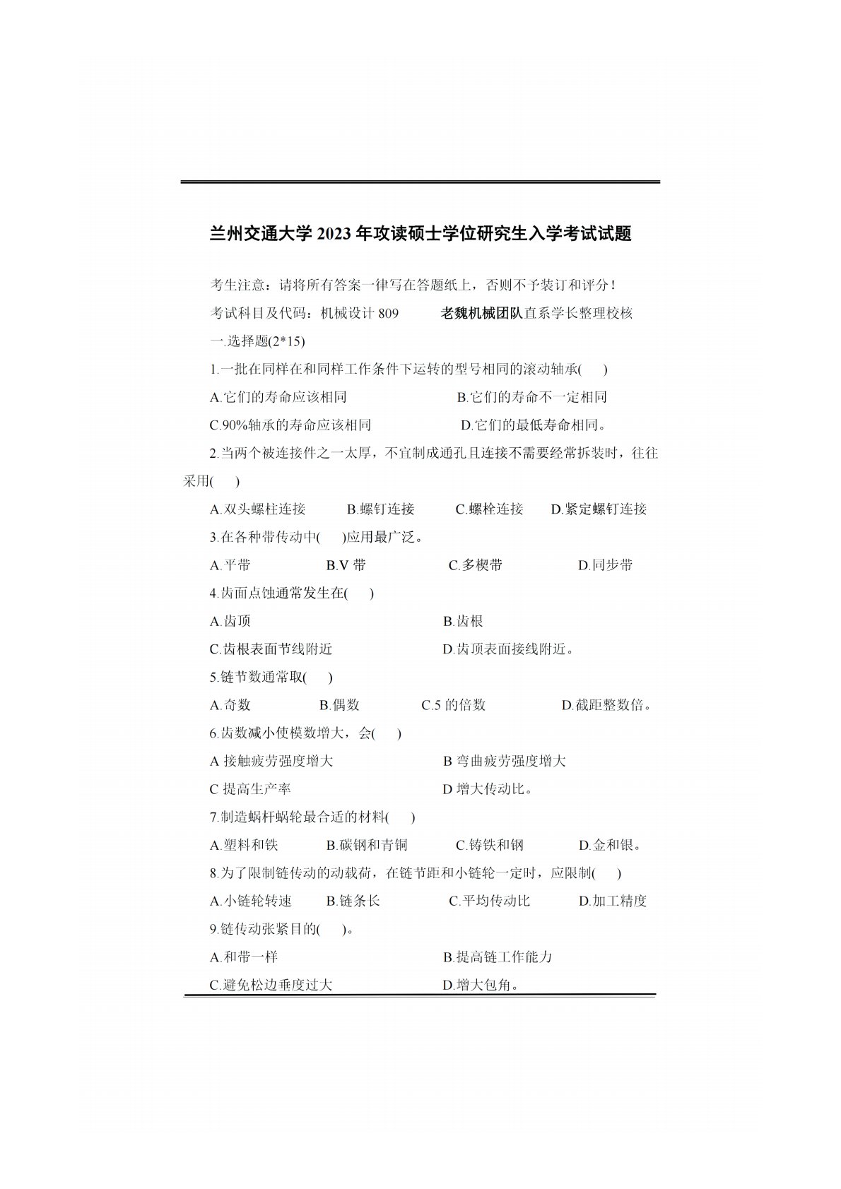 兰州交通大学809机械设计2023年真题