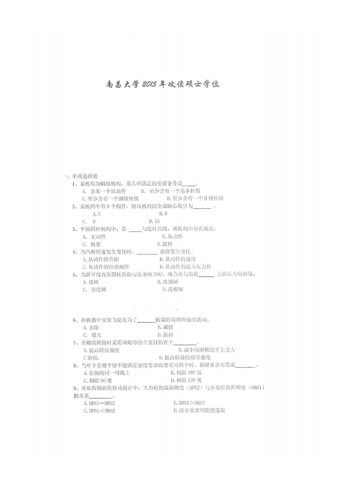 南昌大学827机械设计基础2015年真题