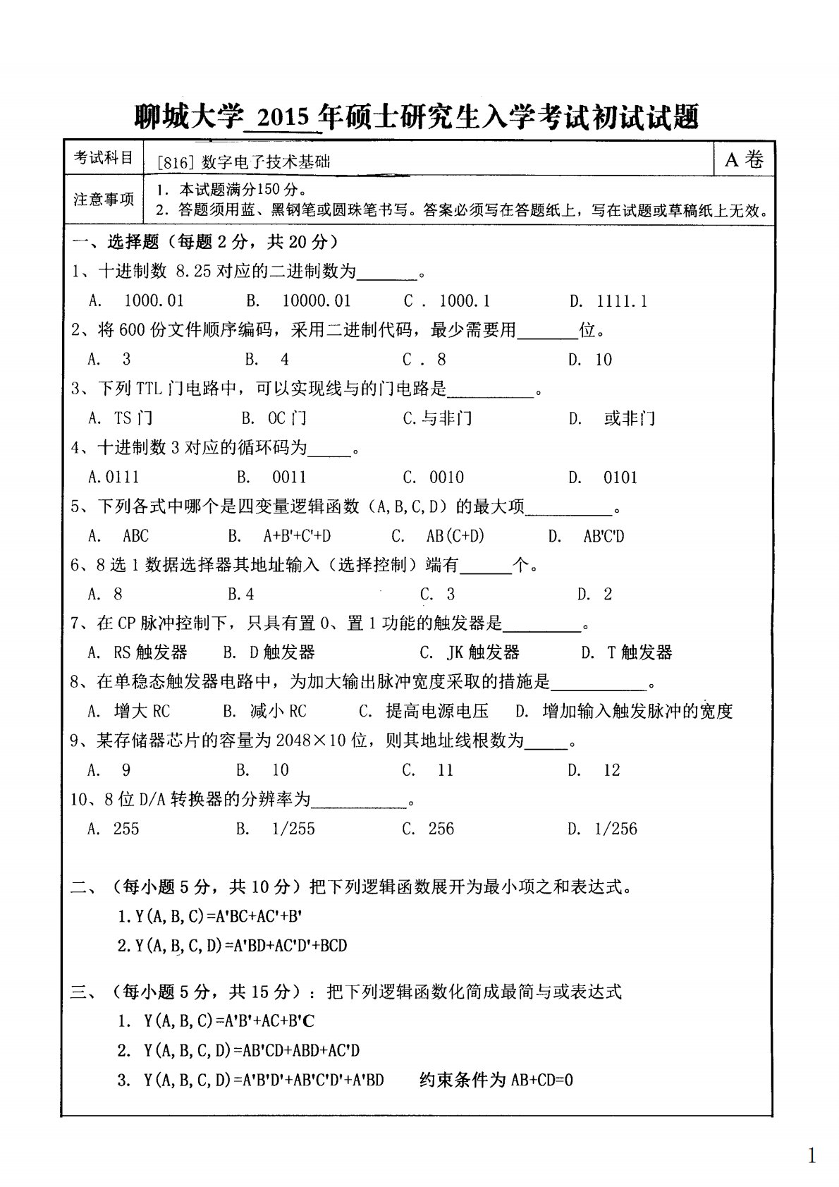 聊城大学816数字电子技术基础2015年真题