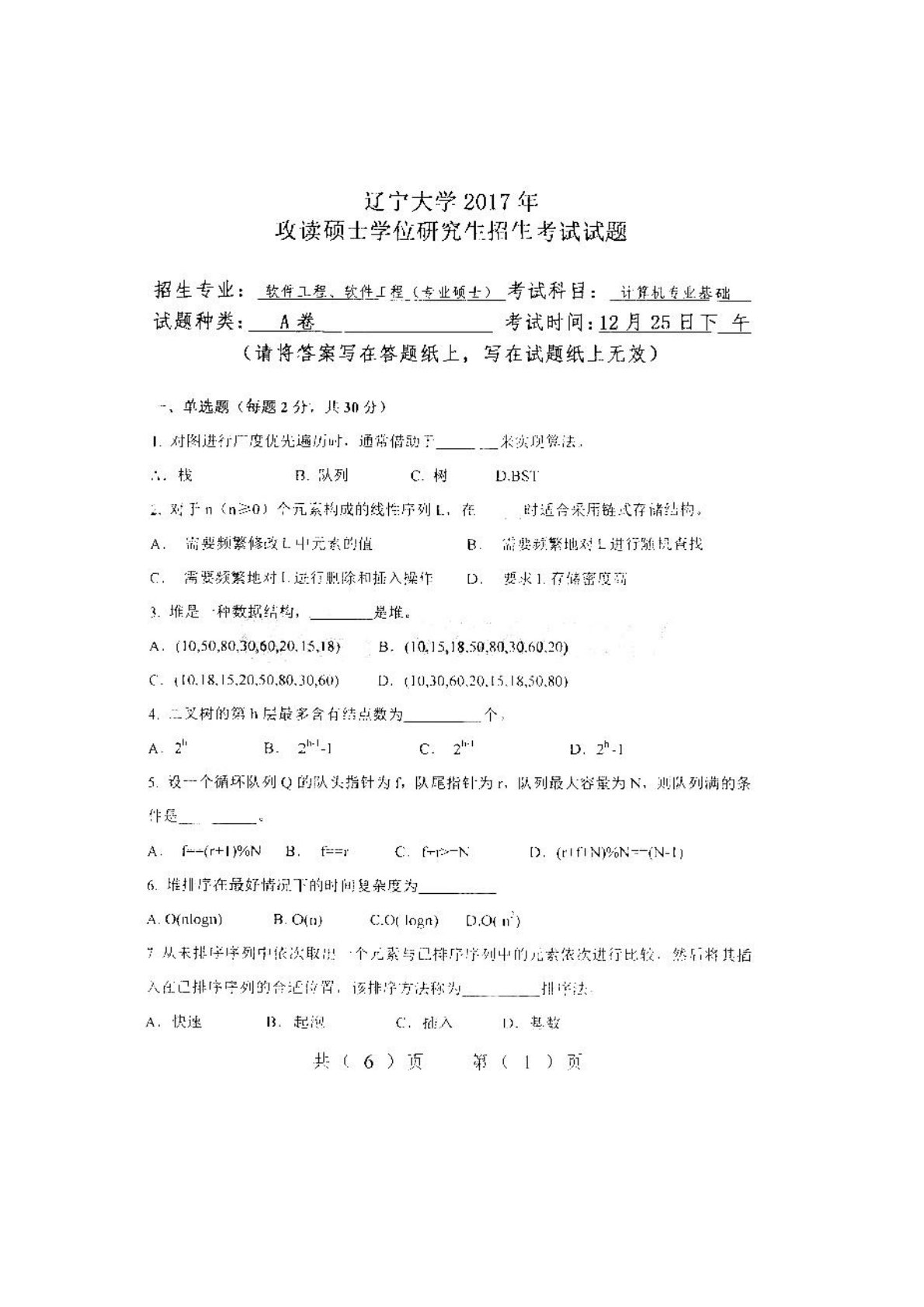 辽宁大学408计算机学科专业基础2017年考研真题