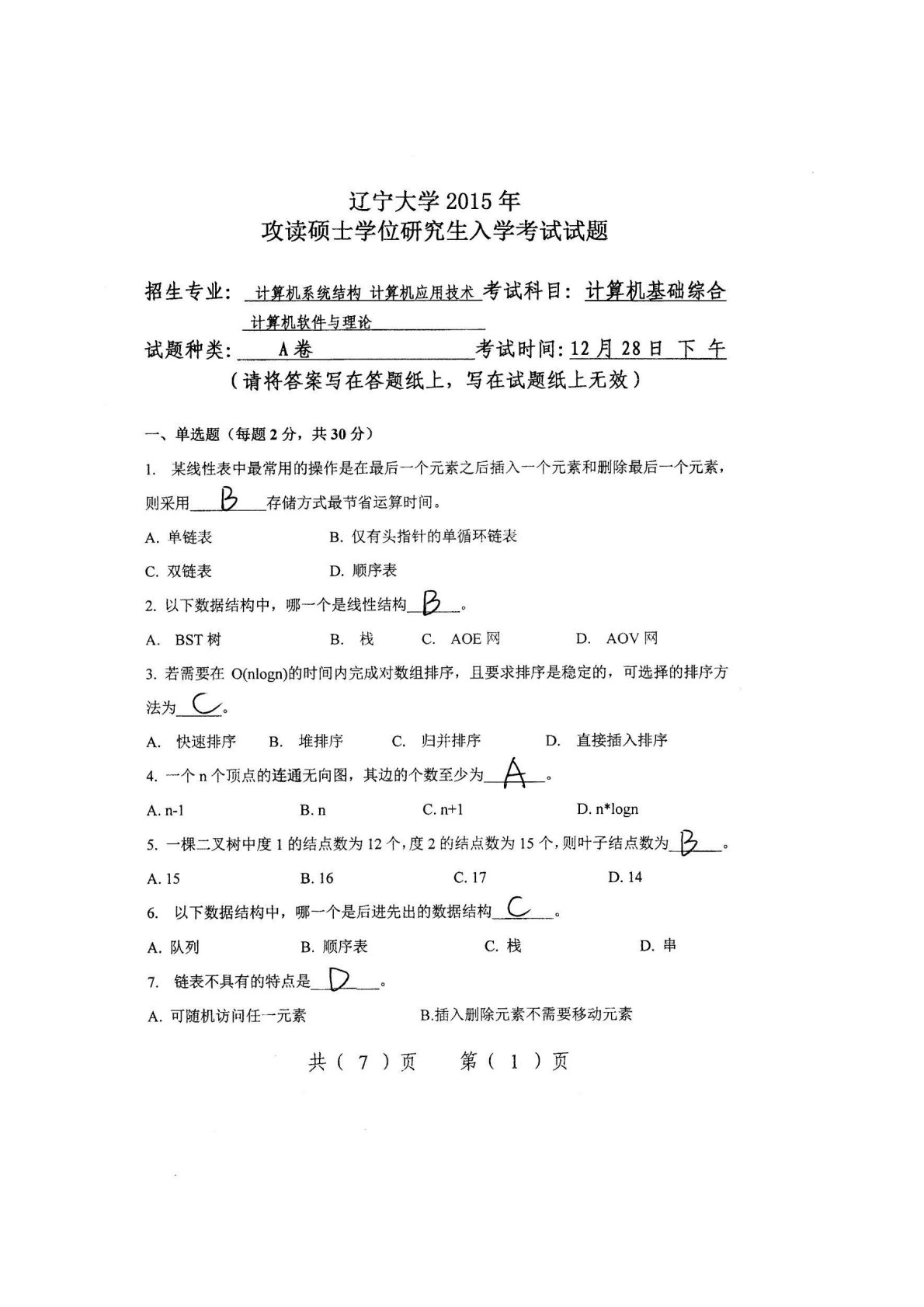 辽宁大学408计算机学科专业基础2015年考研真题(学硕)