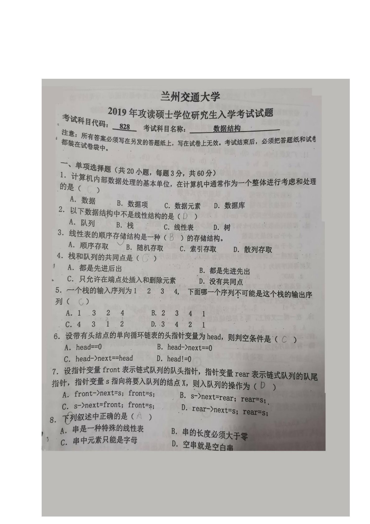 兰州交通大学828数据结构2019年真题