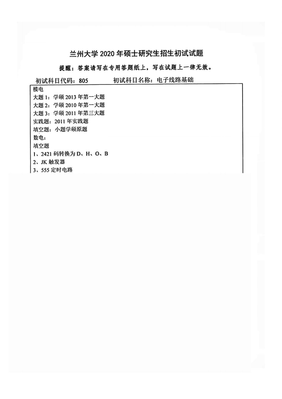 兰州大学805电子线路基础(模拟电路、数字电路)2020年真题(回忆版)
