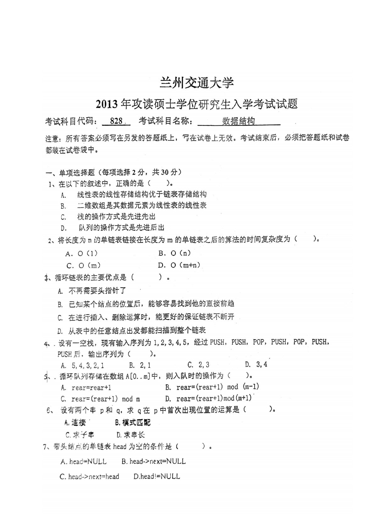 兰州交通大学828数据结构2013年真题