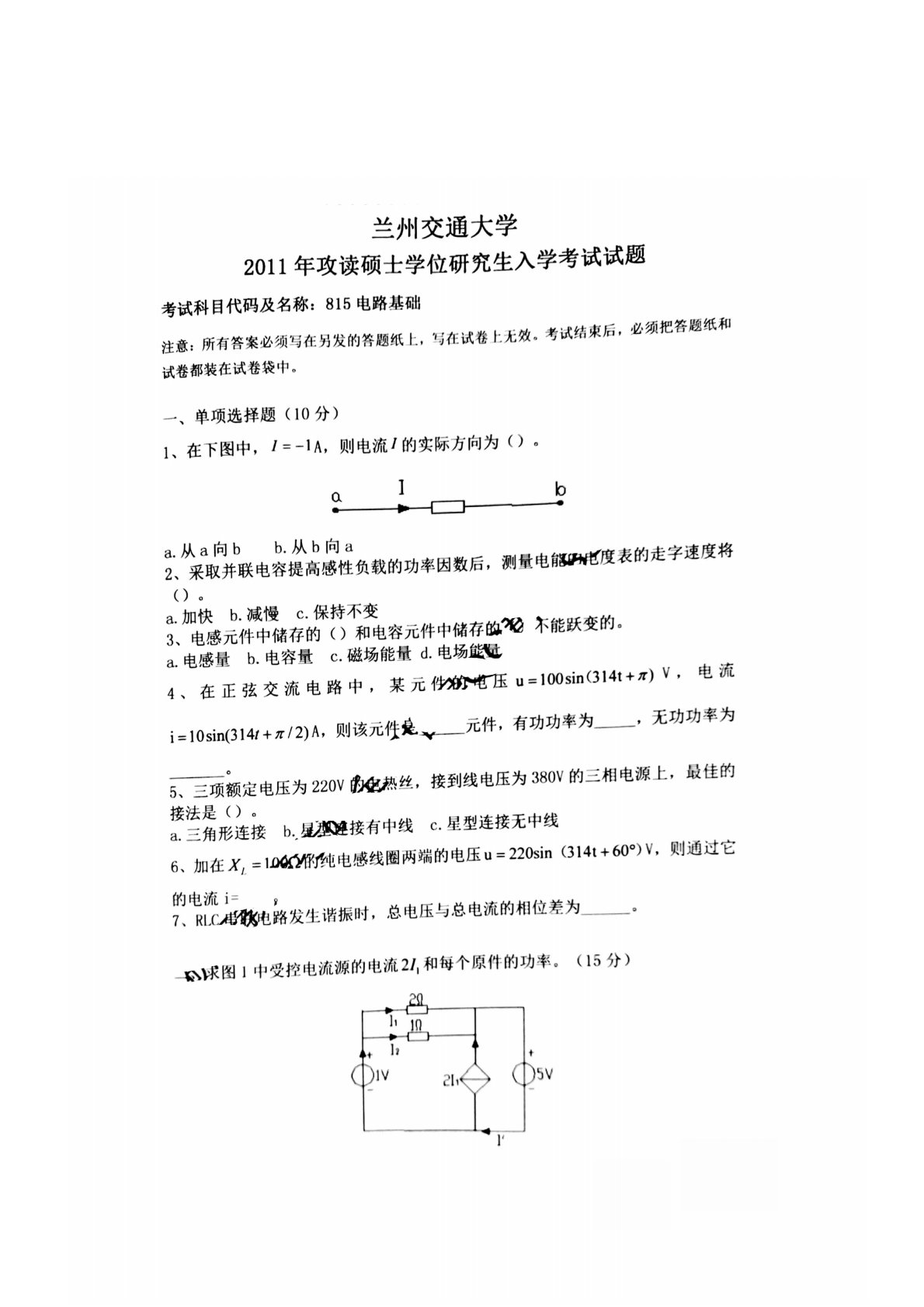 兰州交通大学814电路基础2011年真题
