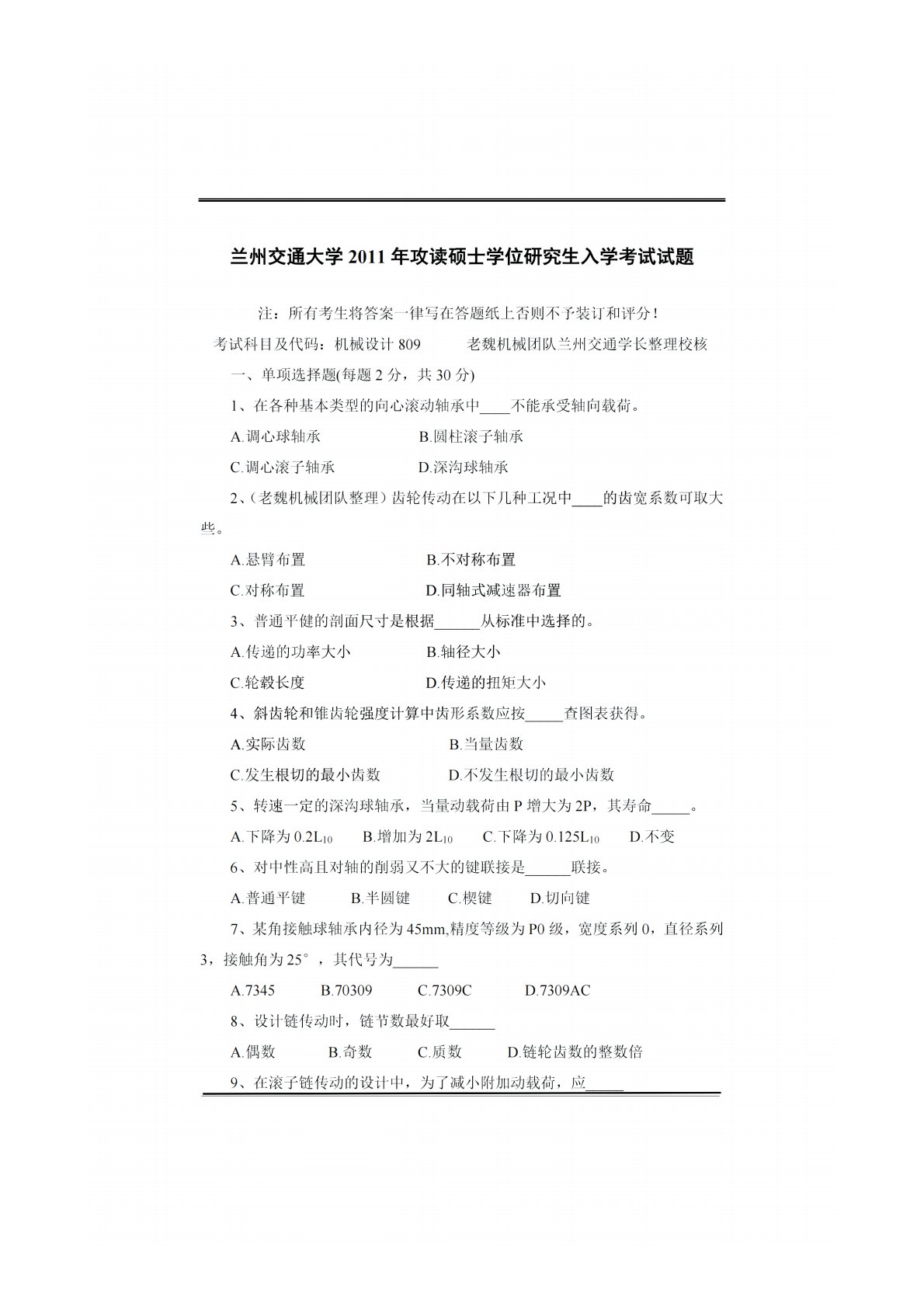兰州交通大学809机械设计2011年真题