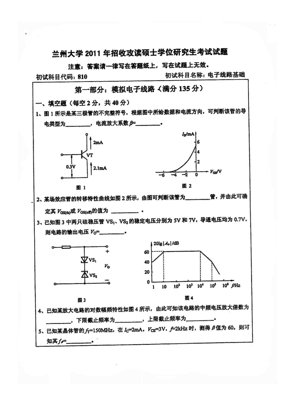 兰州大学805电子线路基础(模拟电路、数字电路)2011年真题1