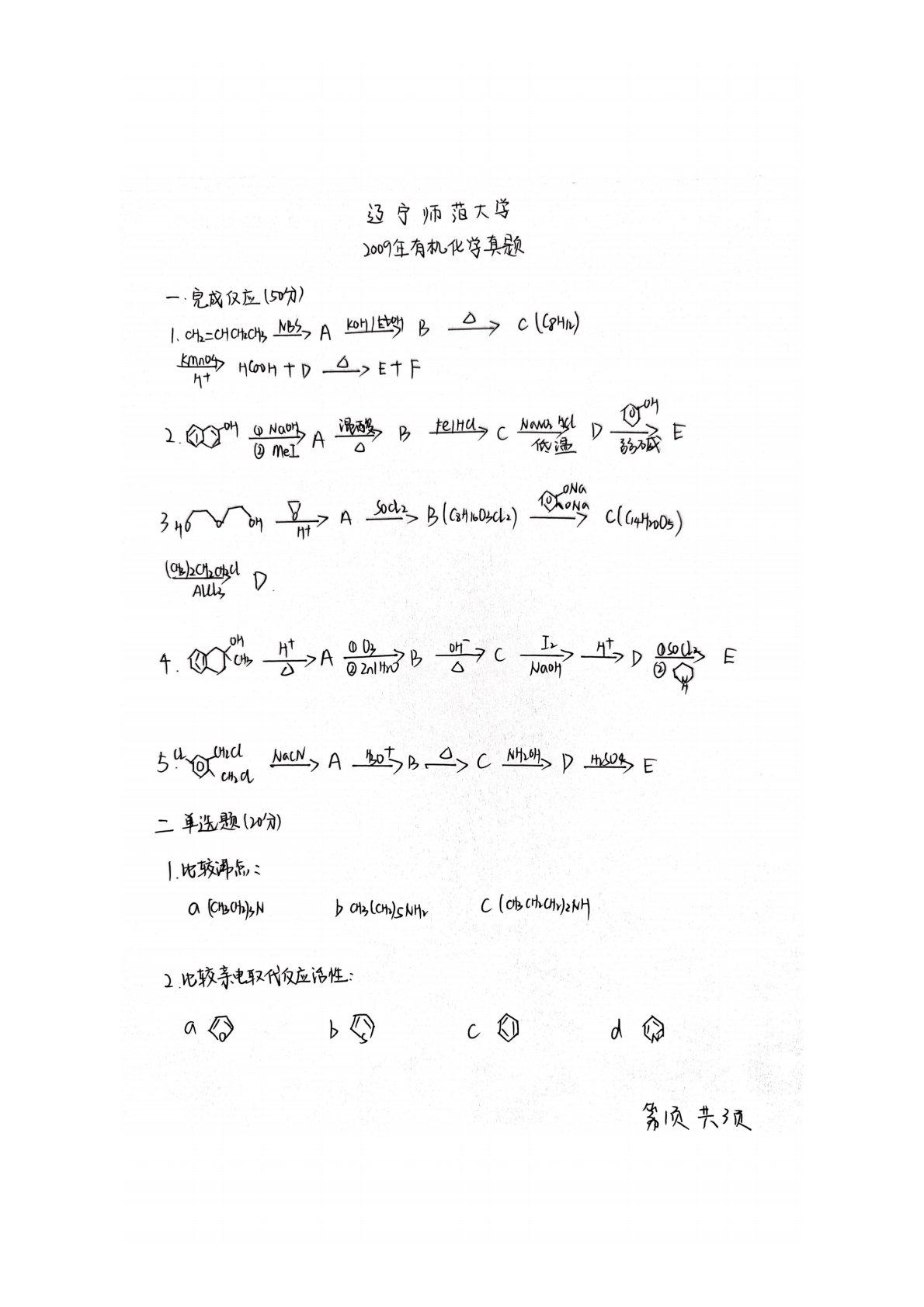 辽宁师范大学719有机化学2009年真题