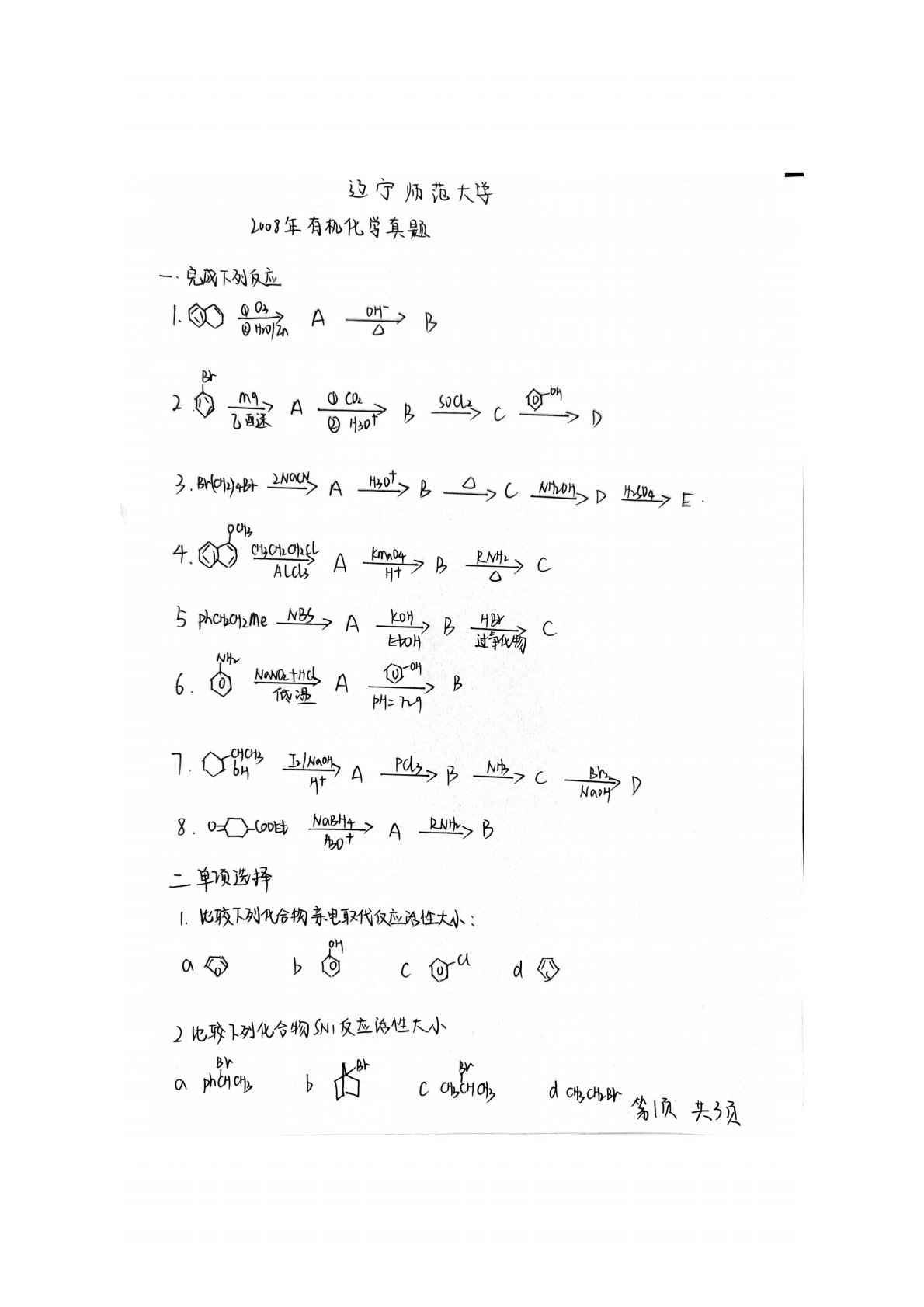 辽宁师范大学719有机化学2008年真题