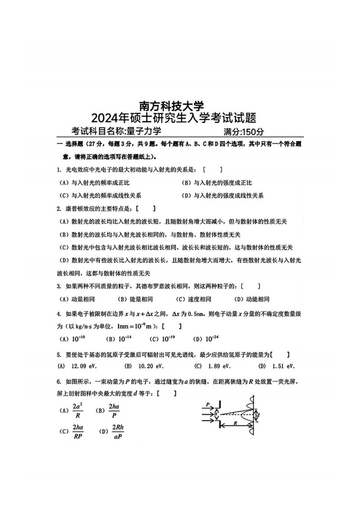 南方科技大学803量子力学2024年真题