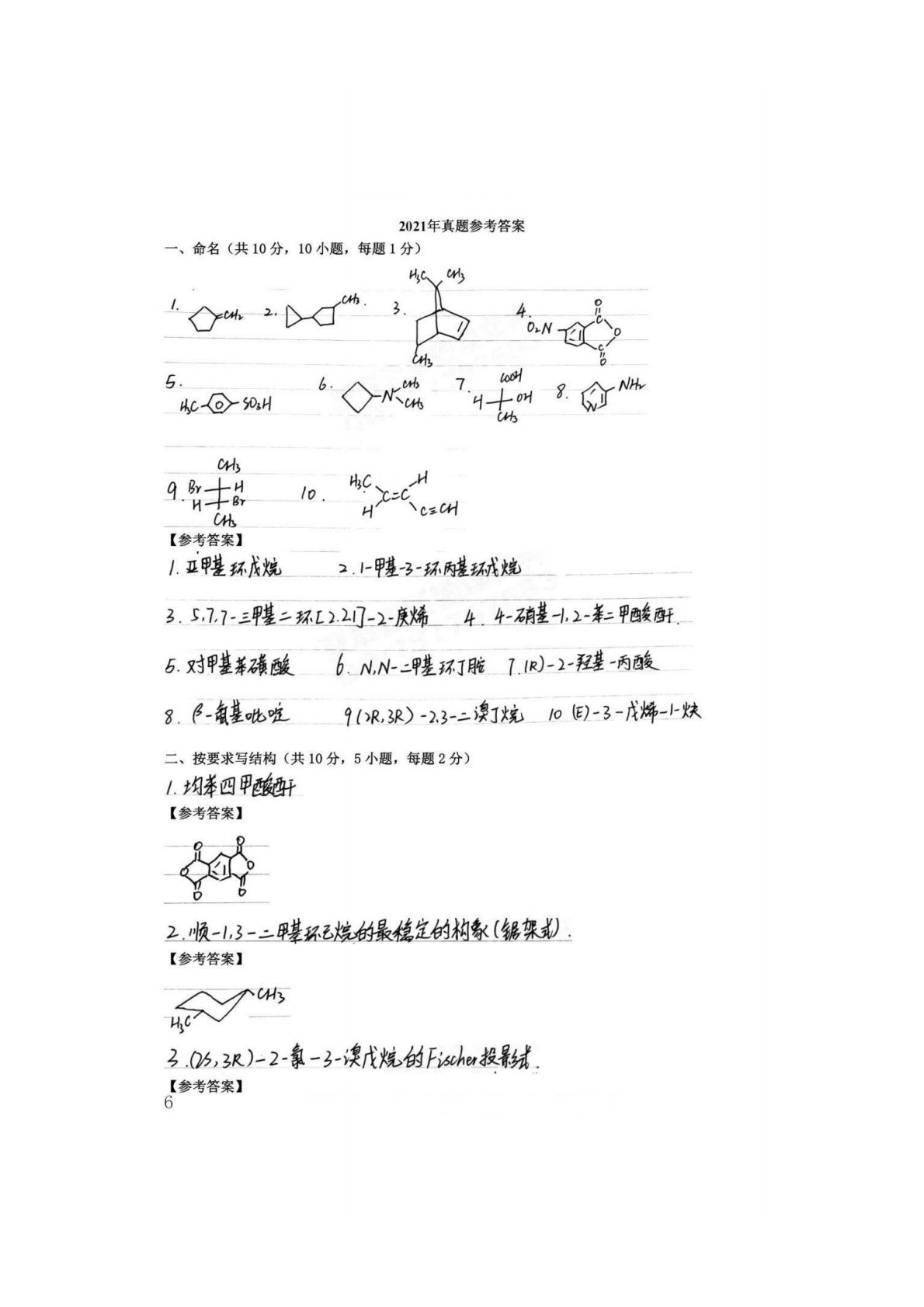 辽宁大学629有机化学2021年真题答案手写版
