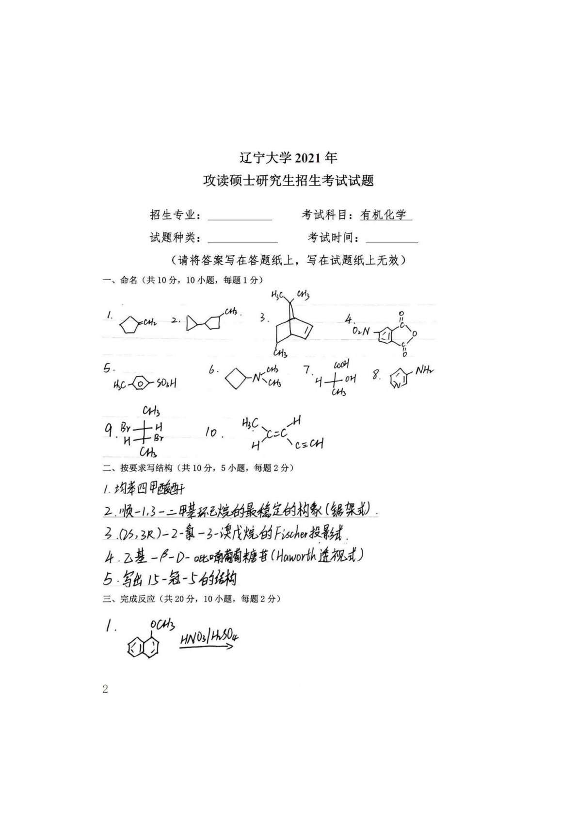 辽宁大学629有机化学2021年真题