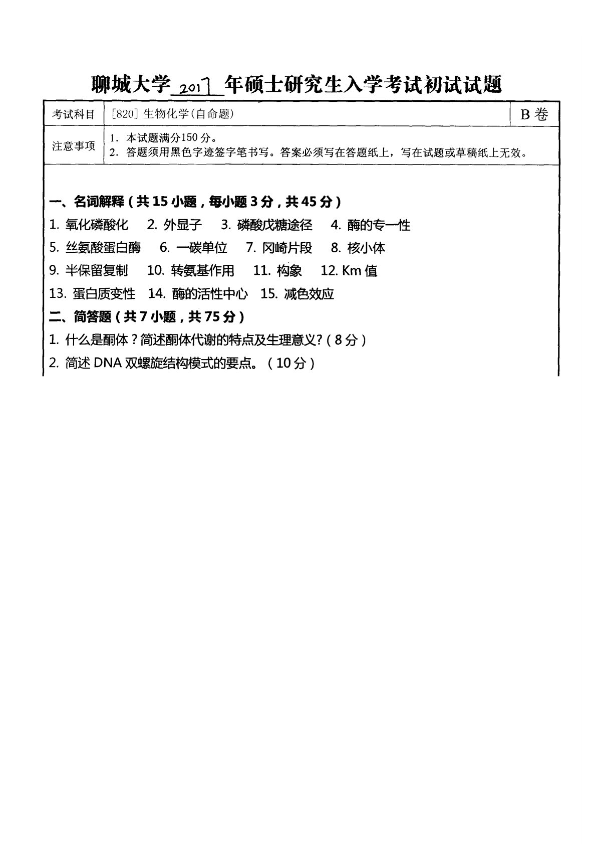 聊城大学820生物化学2017年真题