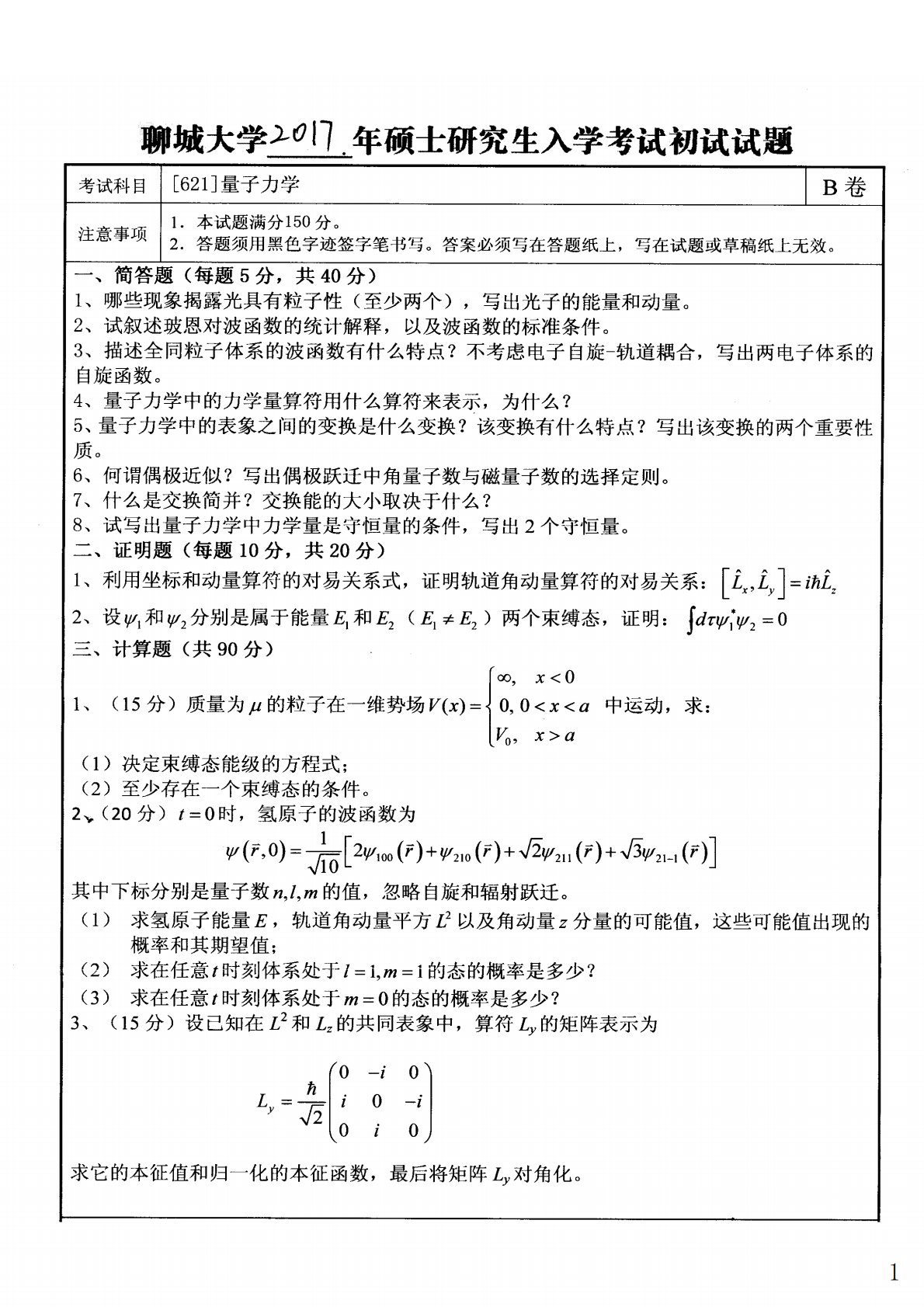 聊城大学621量子力学2017年真题