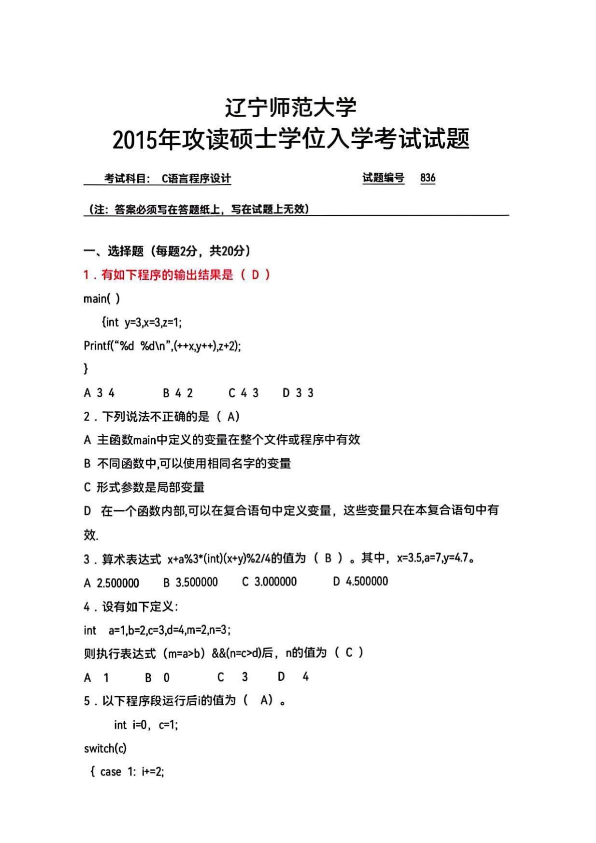 辽宁师范大学827C语言程序设计2015年真题