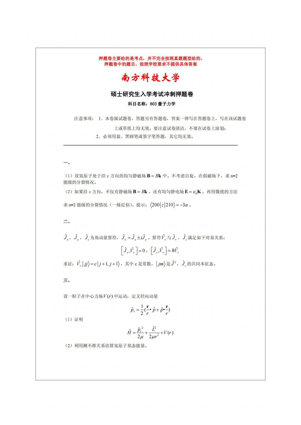 南方科技大学803量子力学冲刺押题试卷2