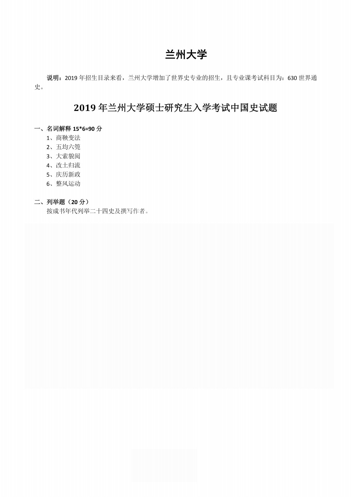 兰州大学632历史学综合2019年考研真题