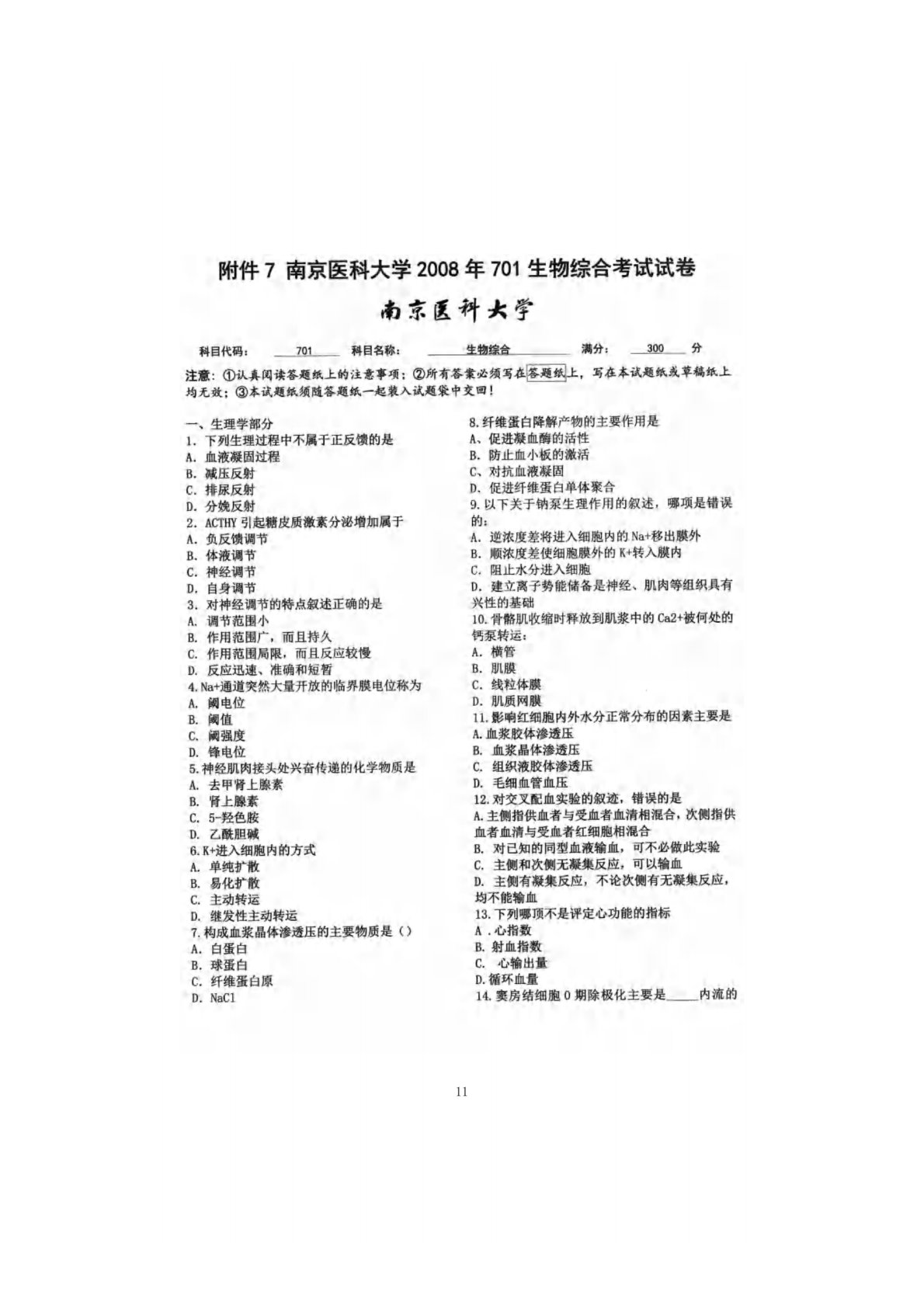南京医科大学710基础医学综合2008年真题(生物综合)