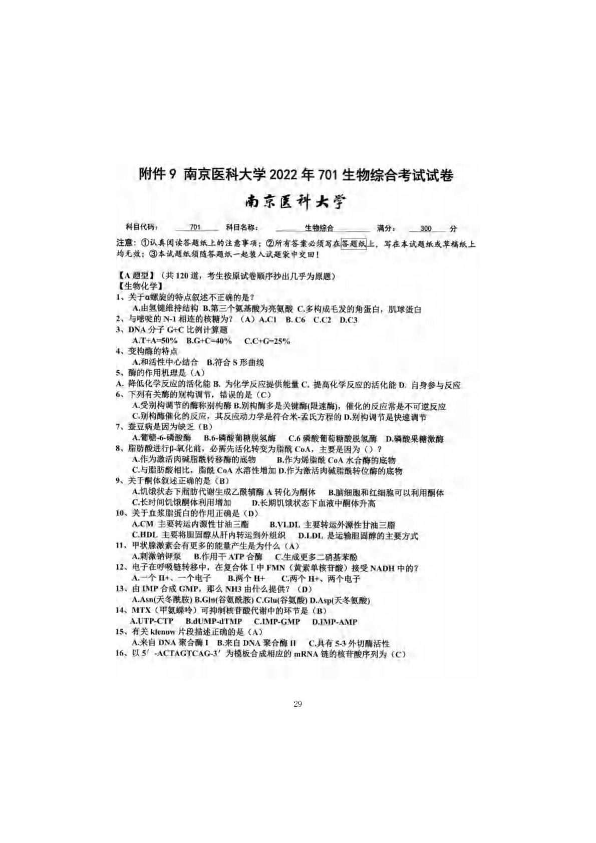 南京医科大学710基础医学综合2022年真题(生物综合)