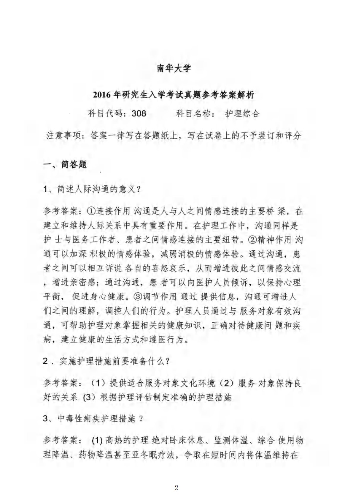 南华大学308护理综合2016年真题答案