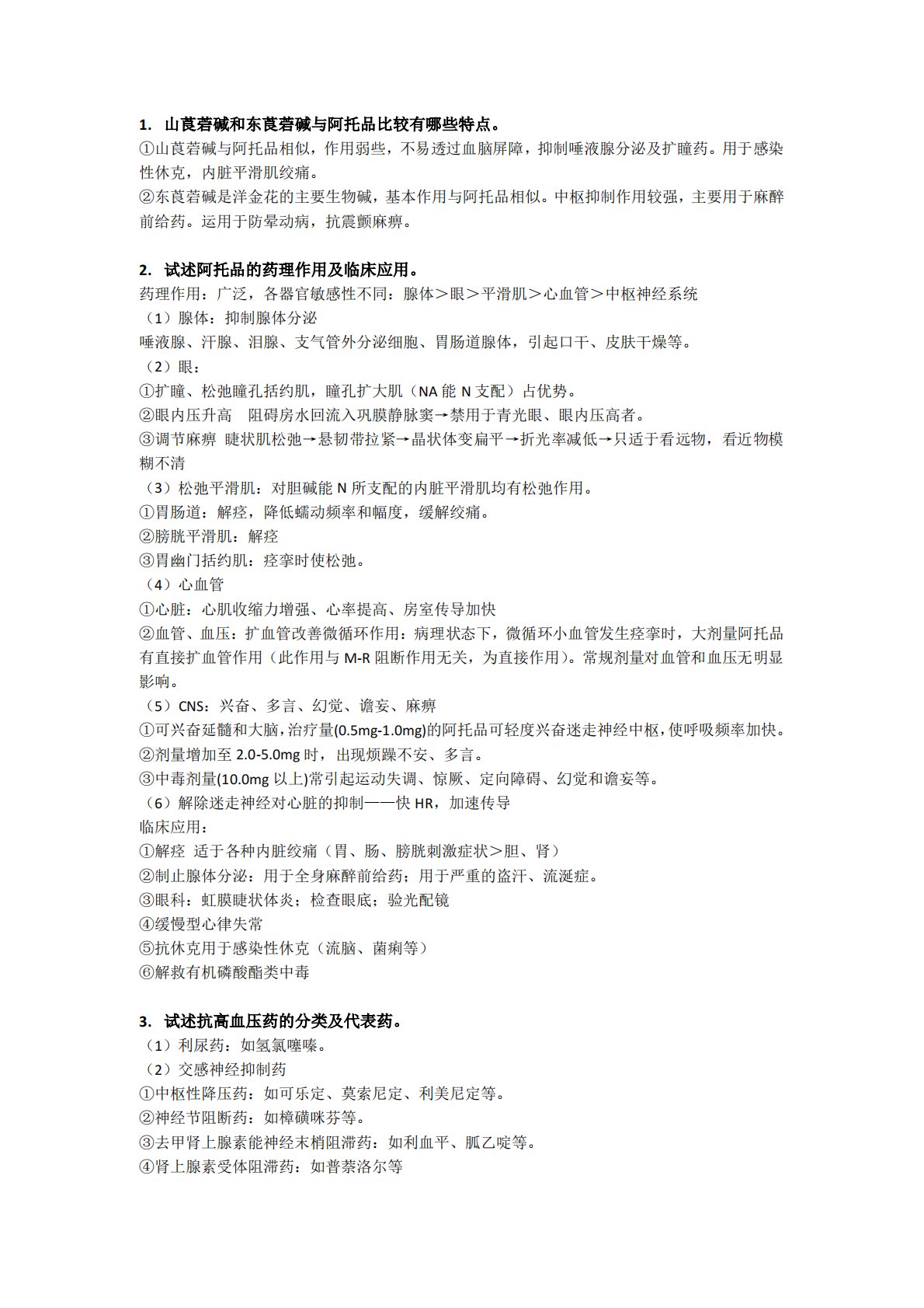 1.山莨菪碱和东莨菪碱与阿托品比较有哪些特点。①山莨菪碱与阿托品相似,作用弱些,不易透过血脑屏障,抑制唾液腺分泌及扩瞳药。用于感染性休克,内脏平滑肌绞痛。②东莨菪碱是洋金花的主要生物碱,基本作用与阿托品相似。中枢抑制作用较强,主要用于麻醉前给药。运用于防晕动病,抗震颤麻痹。2.试述阿托品的药理作用及临床应用。药理作用:广泛,各器官敏感性不同:腺体>眼>平滑肌>心血管>中枢神经系统(1)腺体:抑制腺体分泌唾液腺、汗腺、泪腺、支气管外分泌细胞、胃肠道腺体,引起口干、皮肤干燥等。(2)眼:①扩瞳、松弛瞳孔括约肌,瞳孔扩大肌(NA能N支配)占优势。②眼内压升高阻碍房水回流入巩膜静脉窦→禁用于青光眼、眼...