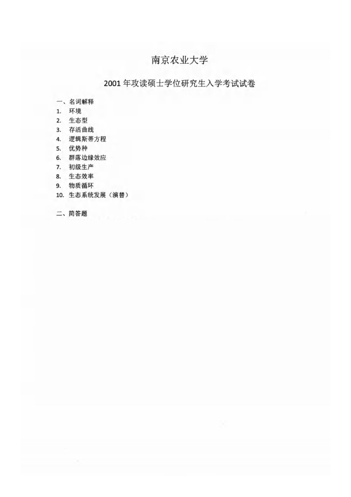 南京农业大学806普通生态学2001年真题