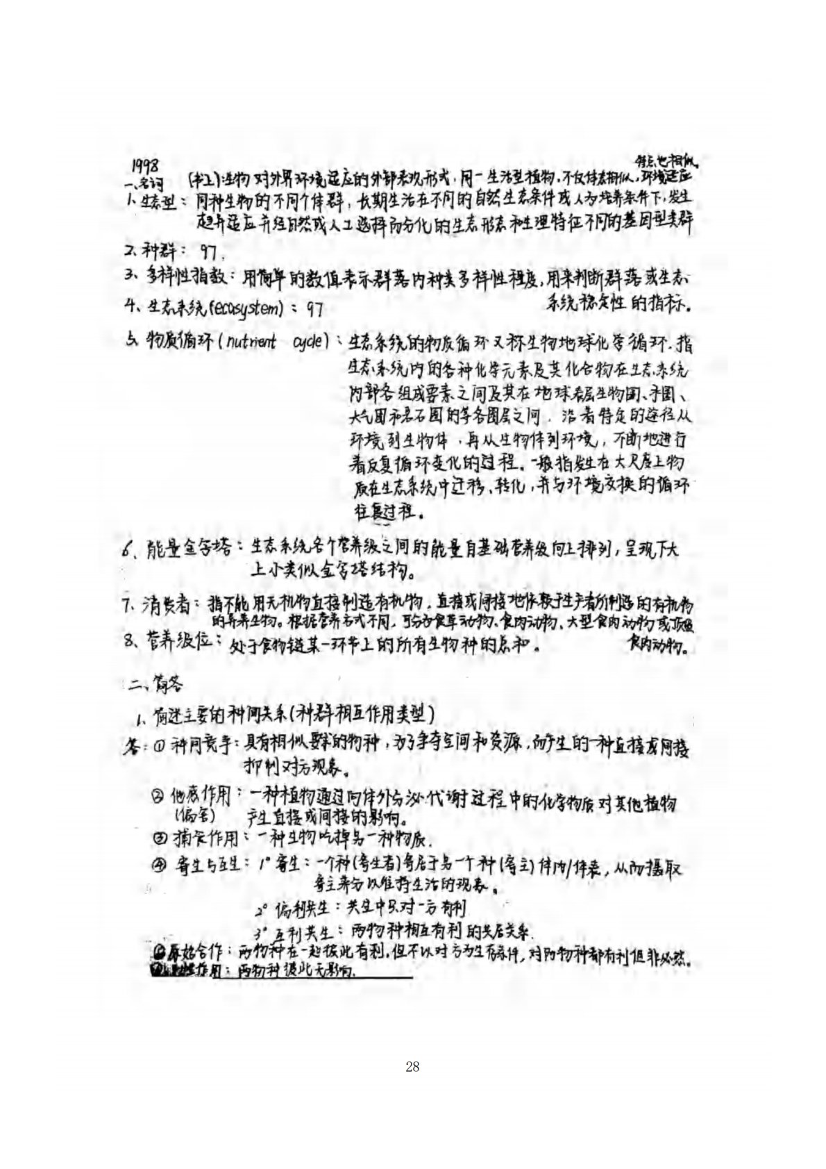 南京农业大学806普通生态学1998年真题答案手写版