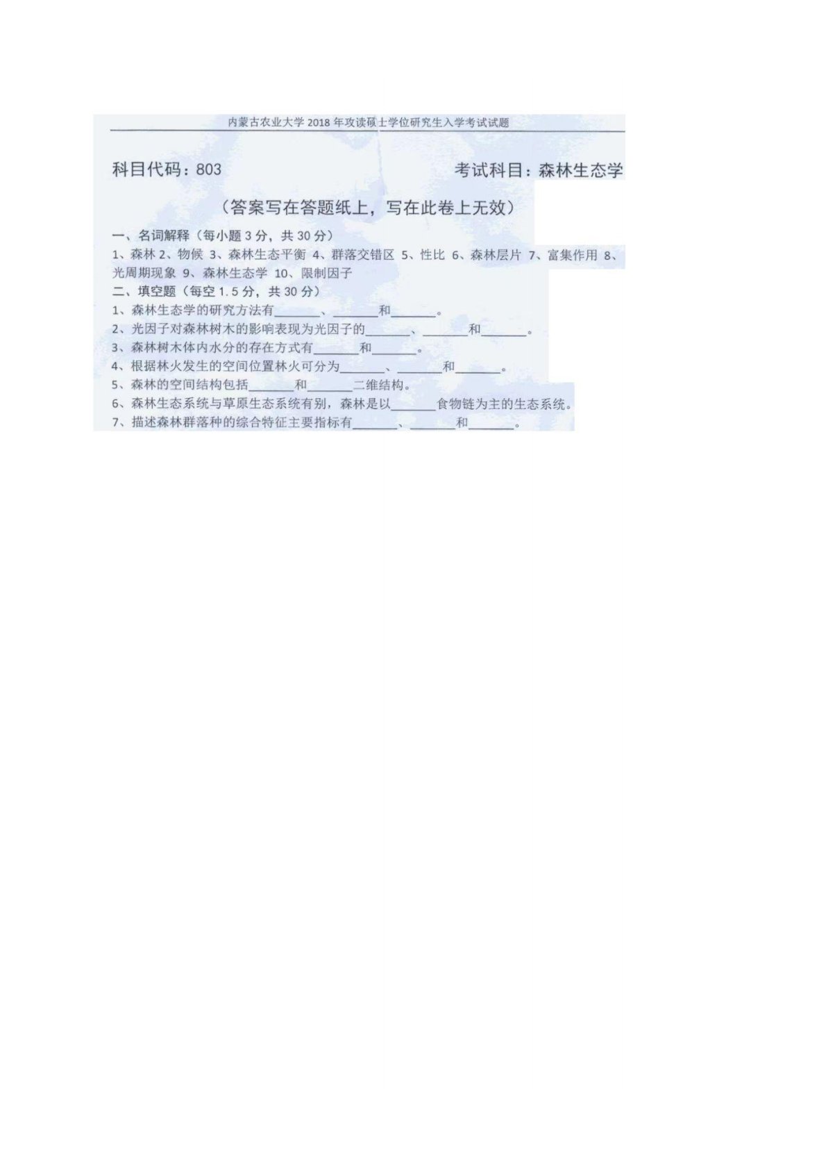 内蒙古农业大学803森林生态学2018年真题