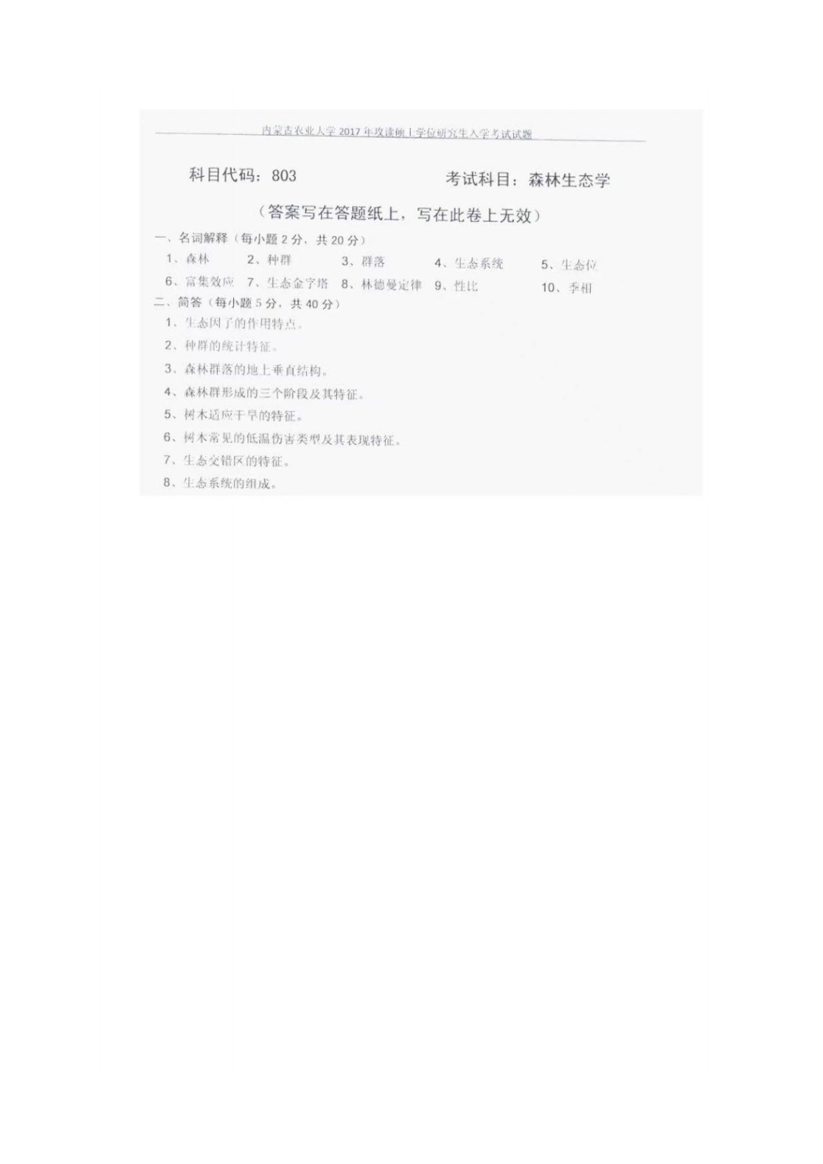 内蒙古农业大学803森林生态学2017年真题