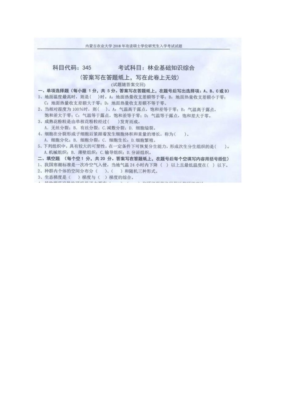 内蒙古农业大学345林业基础知识综合2018年真题