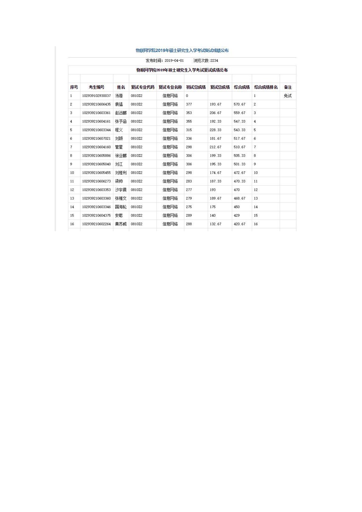 南京邮电大学811数据结构物联网学院2019年硕士研究生入学考试复试成绩公布