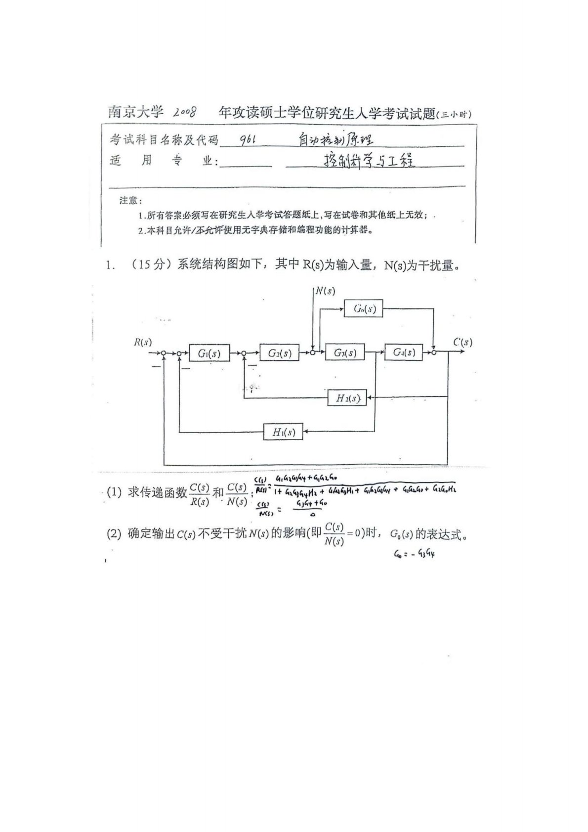 南京大学961自动控制原理(经典60%、现代40%)2008年真题