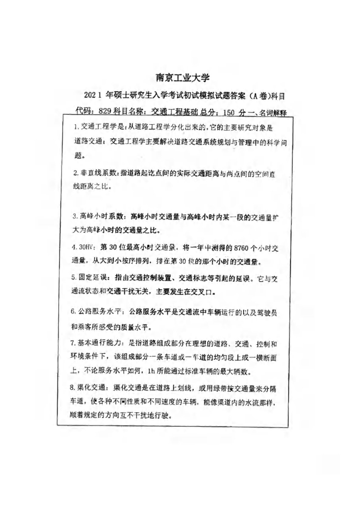 南京工业大学829交通工程基础2021年模拟真题答案A