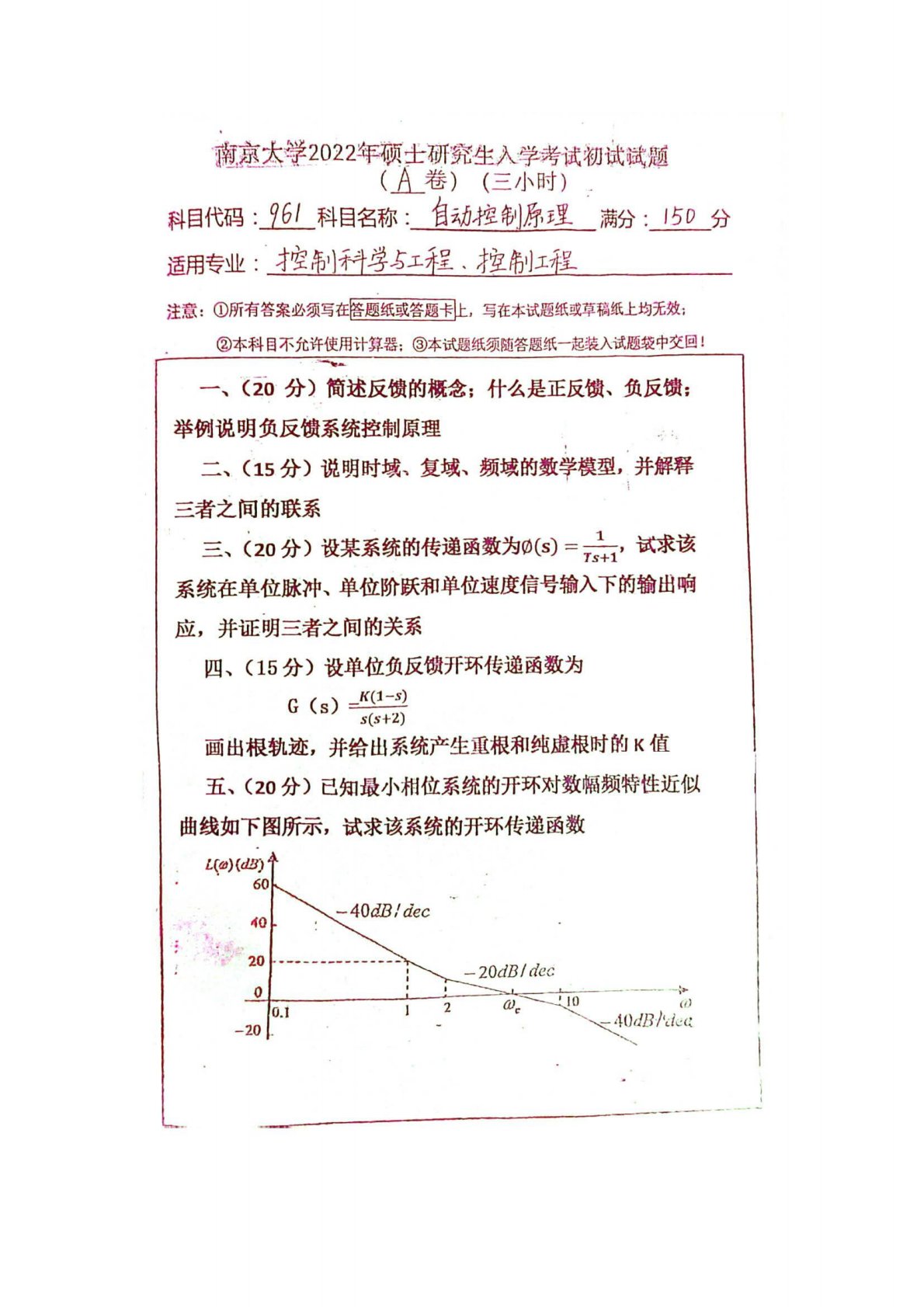 南京大学961自动控制原理(经典60%、现代40%)2022年真题