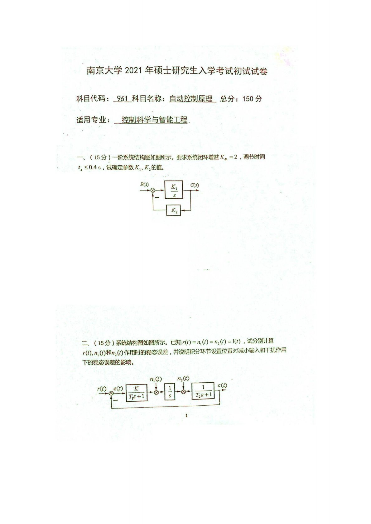 南京大学961自动控制原理(经典60%、现代40%)2021年真题